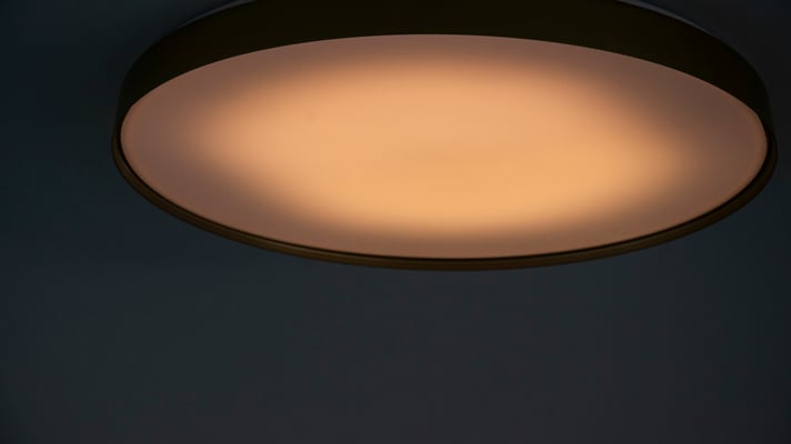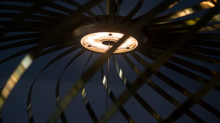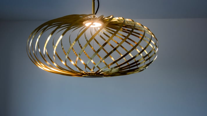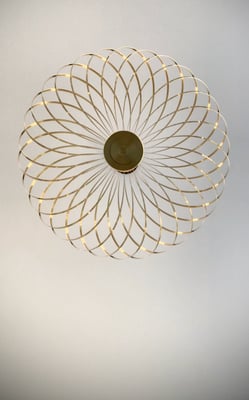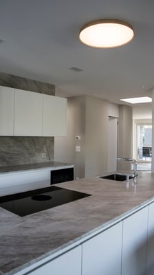 Das Pendant über dem Küchenblock wurde von Luceplan hergestellt und erinnert in seiner Form an eine Sonne, schlicht + schön bei ausgewogenem Licht. Beide Lichtobjekte tragen in ihren Materialien die Farbe "Gold".