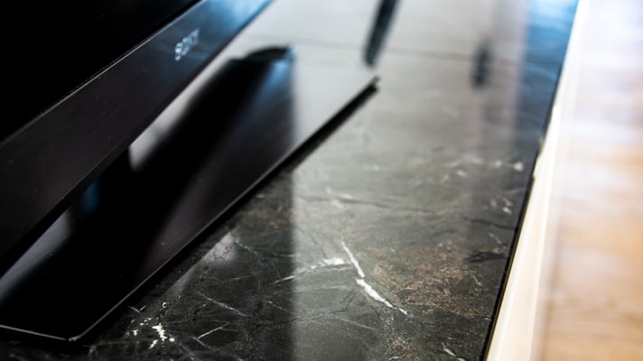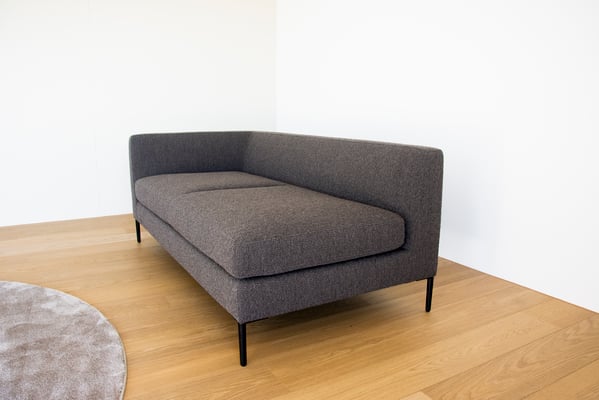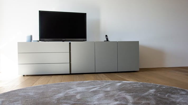 Ein Wohnzimmer mit klaren Formen und Linien. Das Sideboard von interlübke: unaufgeregte klare Linien mit feinen Details, die überraschen. So entdeckt man eine marmorierte Platte, die vertieft angebracht wurde. Das Spiel mit den Tiefen und Verstecken kann man im gesamten Möbelstück finden. Die Couch, ebenfalls von montis, teilt sich den anderen Teil des Wohnzimmers mit einem runden Wohlfühlteppich von den Teppichkünstlern van besouv.