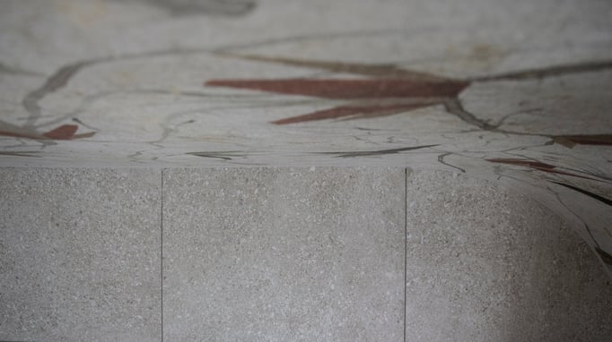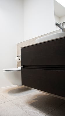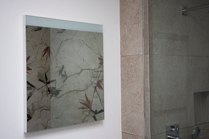 Auch hier spielen Rundungen eine grosse Rolle. Ein Badezimmer mit filigran gemusterter - an die japanische Faltkunst Origami erinnernde - Wet-Tapete von W&D. Abstrakt kantig und doch hinterlassen die farbigen Formen einen floralen Eindruck. Mit dem Wetsystem lassen sich Duschräume in wahre "Kunstwerke" verwandeln - es gibt so vielfältige Möglichkeiten: schlicht modern bis verspielt bunt. Mit diesem System sind wir bestens vertrat - wir beraten Sie gern.