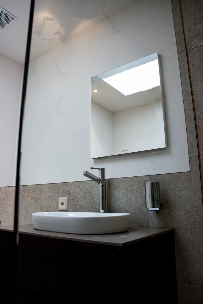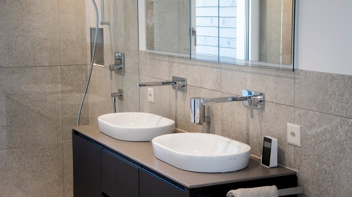 Im zweiten Bad wird es etwas ruhiger, hier dominieren die warme mediterrane Fliesse und die dunkle Eiche. Und natürlich auch hier sind Rundungen zu finden, die das Kantige etwas aufbrechen.