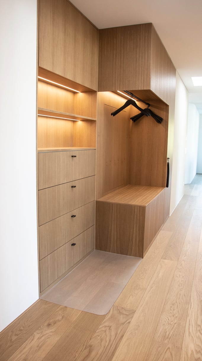 Flur: hier ist eine grosszügige Flurgarderobe mit viel Stauraum und eleganten Details, wie indirektes Licht und Ledergriffe, entstanden. Konzipiert + gezeichnet von uns - erbaut von den Holz-und Möbelexperten aus St. Margrethen / Zoller + Kellenberger.